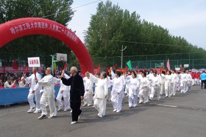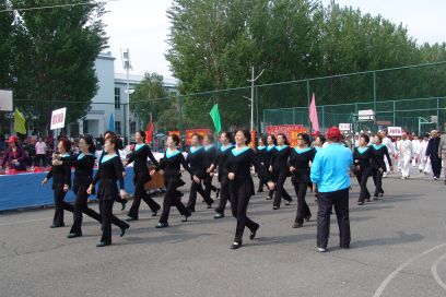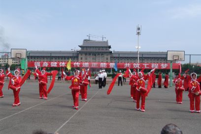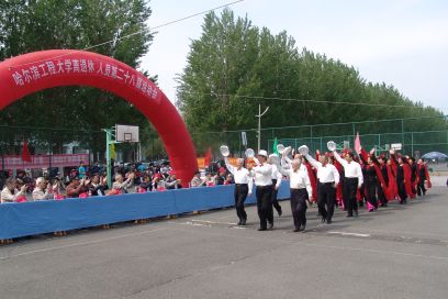 随后,各表演团队相继表演了自己精心编排的节目。健美操队、柔力球队、太极拳队、服饰队的表演柔中带刚、舞步欢快、服装整齐。哈工程大学社区的同志前来祝贺,表演了腰鼓《开门红》,引起现场观众的阵阵掌声。