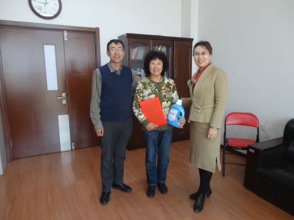 上图为离退休处领导为吕秀华颁发证书与纪念品。