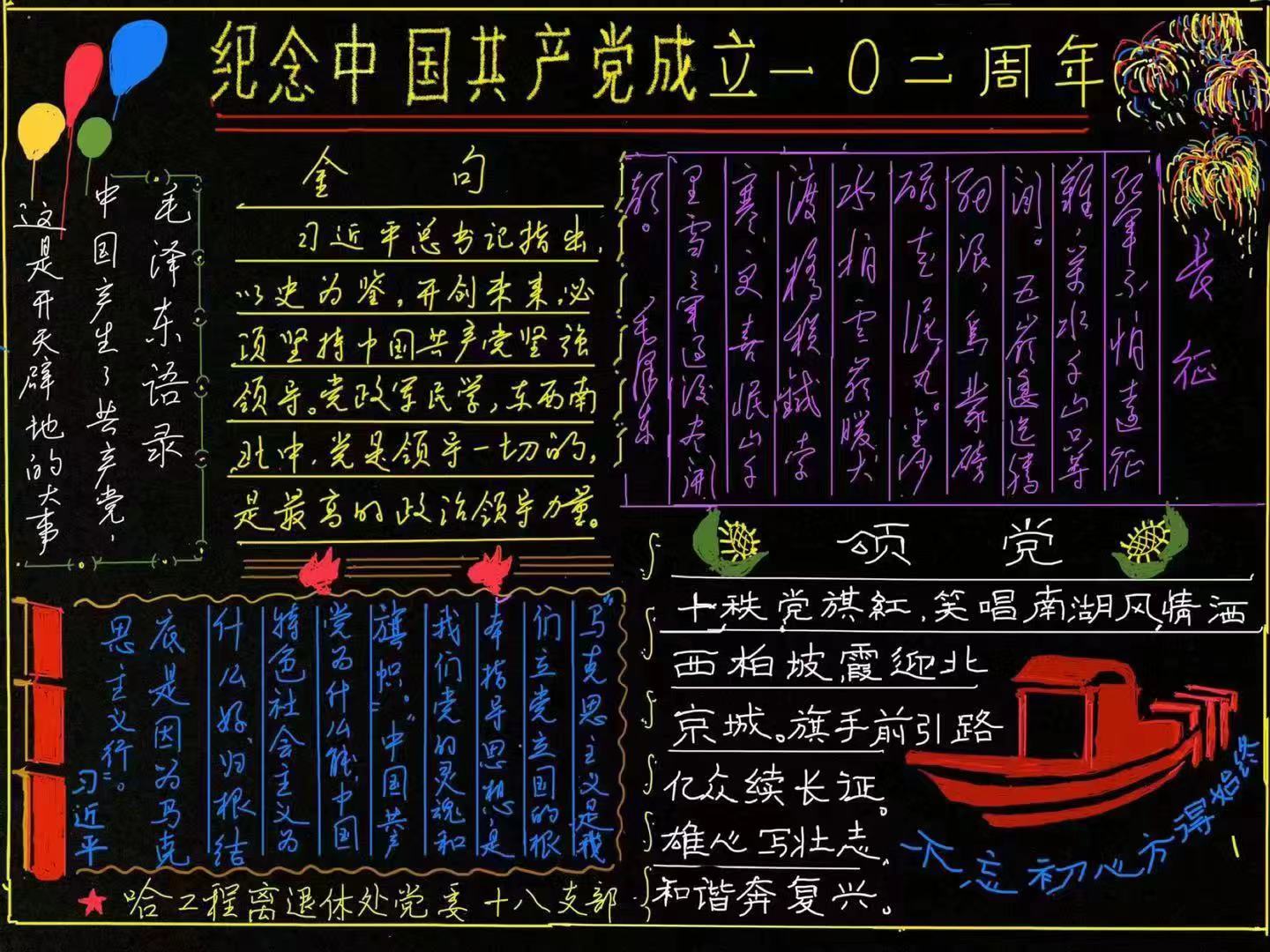 本次主题展示活动以设计绘制黑板报为载体,紧紧围绕全校离退休党员在学习过程中涌现出的先进典型,以及他们的感人故事、心得体会、学习经验等内容,做好宣传和展示工作。