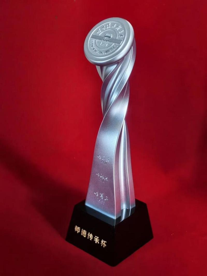 “师德传承杯”由我校庄严老师设计,其设计源于奔腾的海浪,杯身镌刻着学校发展的重要时间节点,犹如记录下代代师者砥砺前行、接续奋斗的峥嵘历程;海浪汇聚为澎湃的力量,托起校徽,寓意教师以赤诚初心接力传承,托举起学生的成长理想和学校的发展希望;校徽在顶端熠熠生辉,象征着学校在师德传承与育人实践中,正向着更高更远的目标破浪前行!