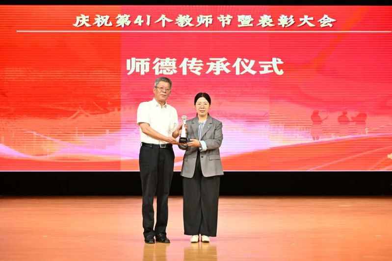 庄严的师德传承仪式上,离退休教师代表郑洪涛将“师德传承杯”传递给新进教师王颖。