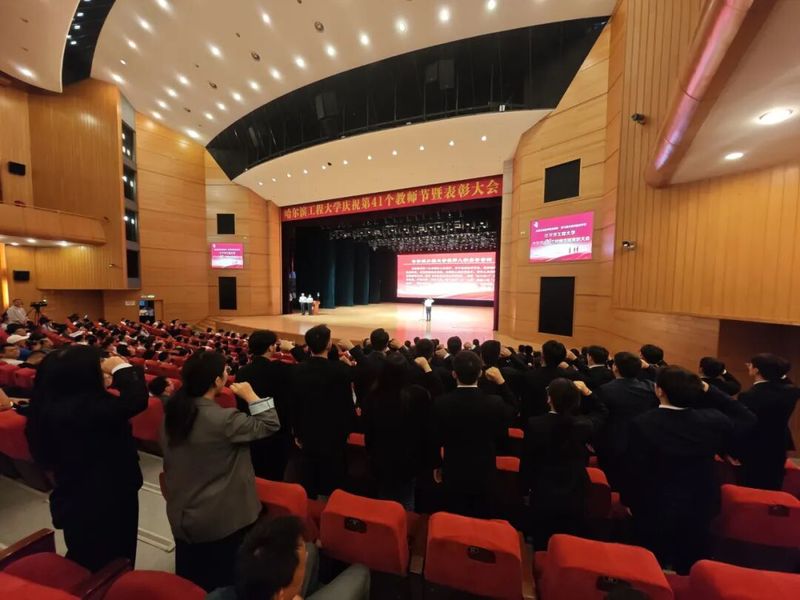 “我志愿成为一名光荣的人民教师,忠于党的教育事业,履行教师神圣职责。自觉承担追求真理、立德树人的崇高使命,传承人类文明,播撒创新火种。遵守《哈尔滨工程大学章程》,践行‘三个第一’价值追求。严谨治学,甘为人梯。做‘经师’和‘人师’相统一的‘大先生’,做让党放心、人民满意的好教师,为国家培养‘可靠顶用、拔尖创新’的精英人才,为创建特色鲜明世界一流大学不懈奋斗!”新进教师代表在离退休教师代表郑洪涛的带领下,面对国旗,举起右拳,庄严宣誓。