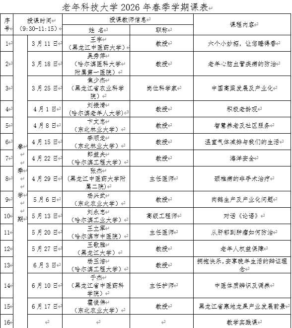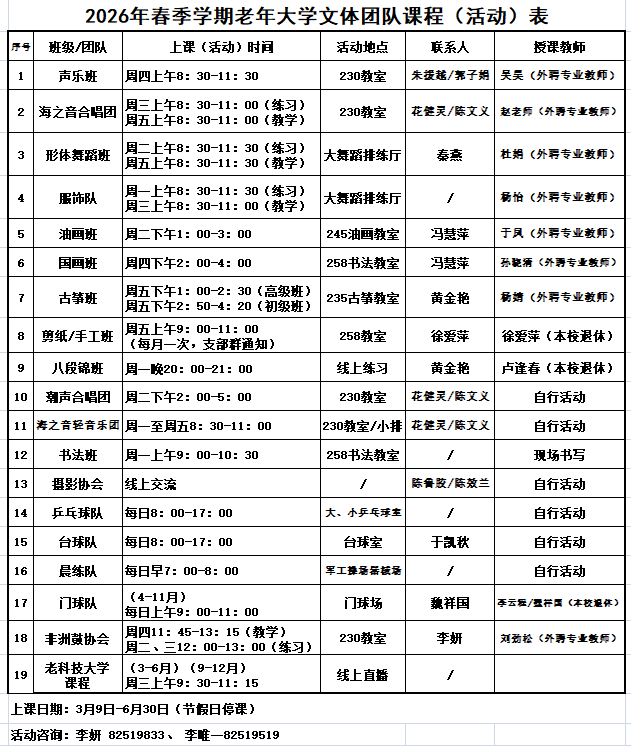 校老年大学2026年春季学期课程安排如下,欢迎广大离退休教职工踊跃参与。